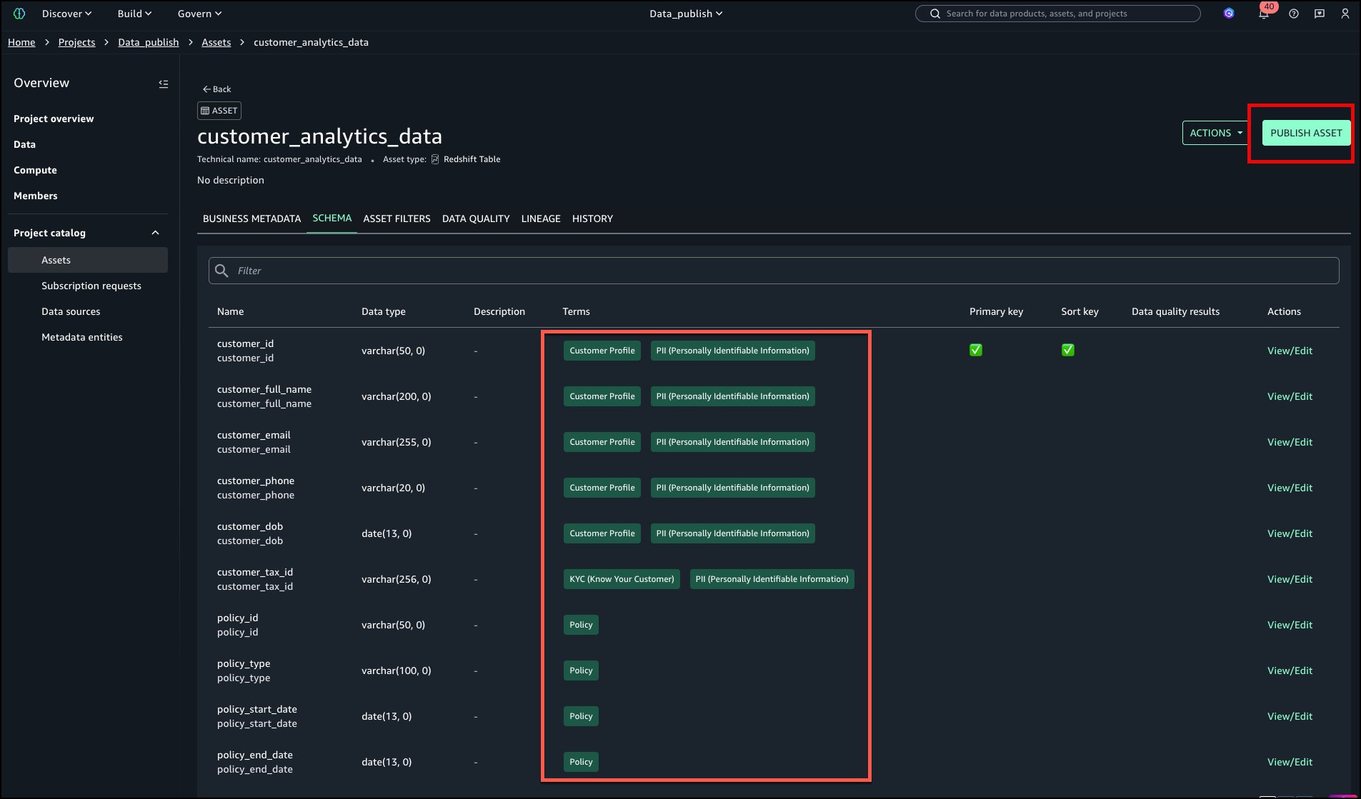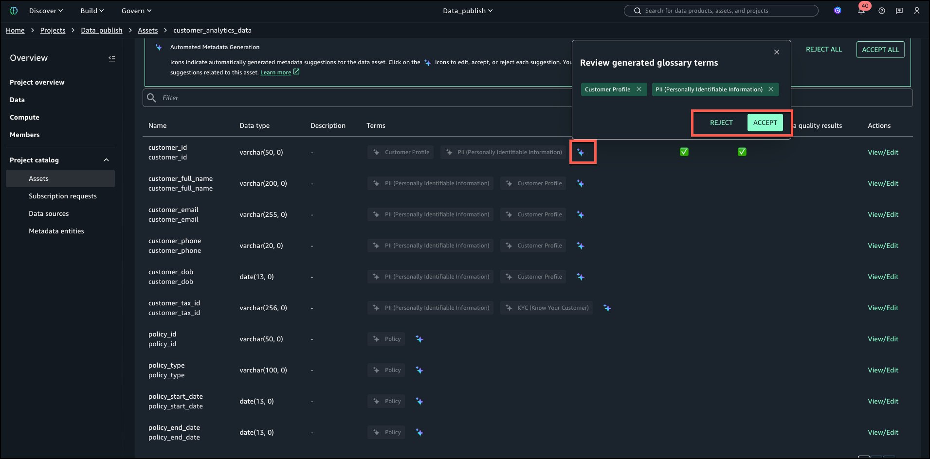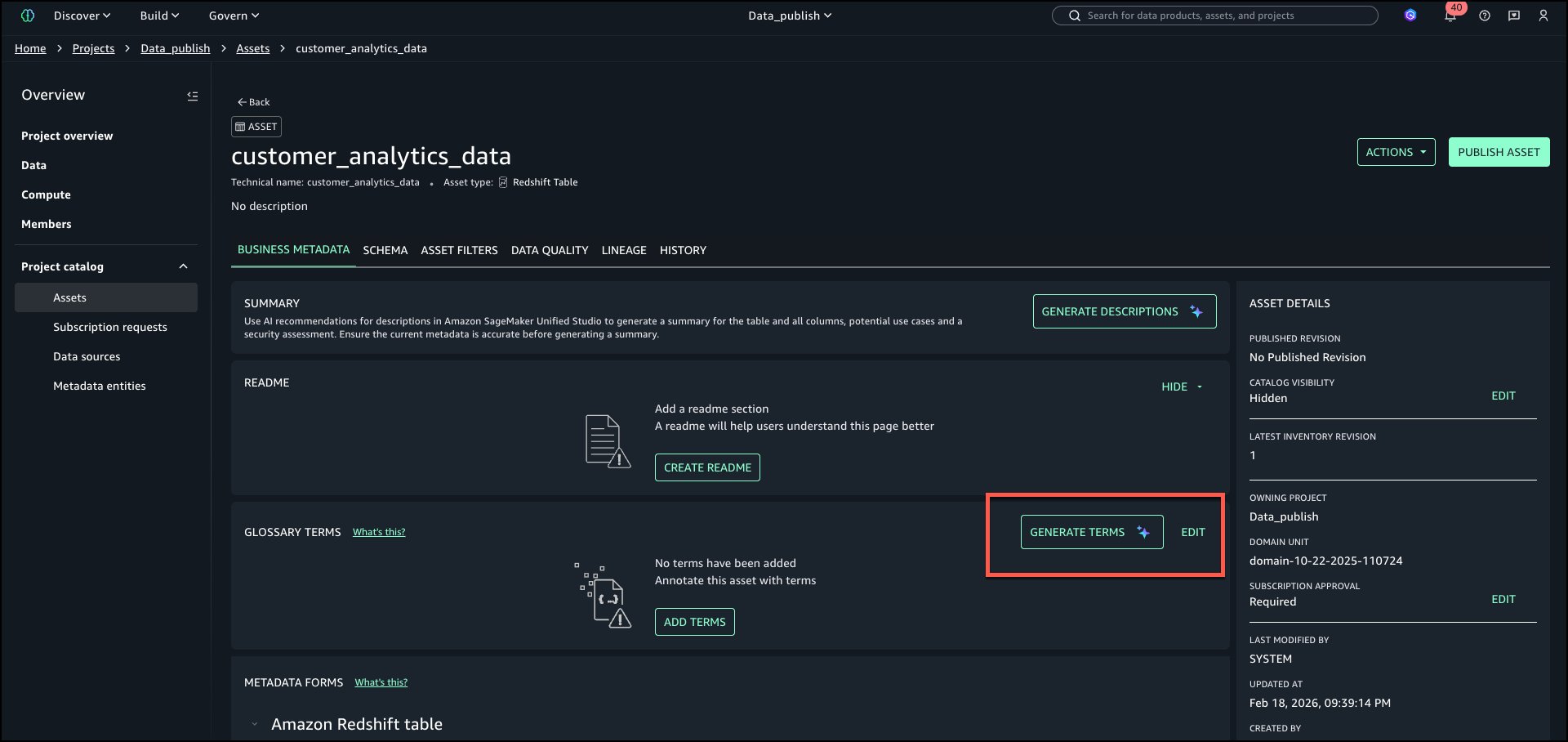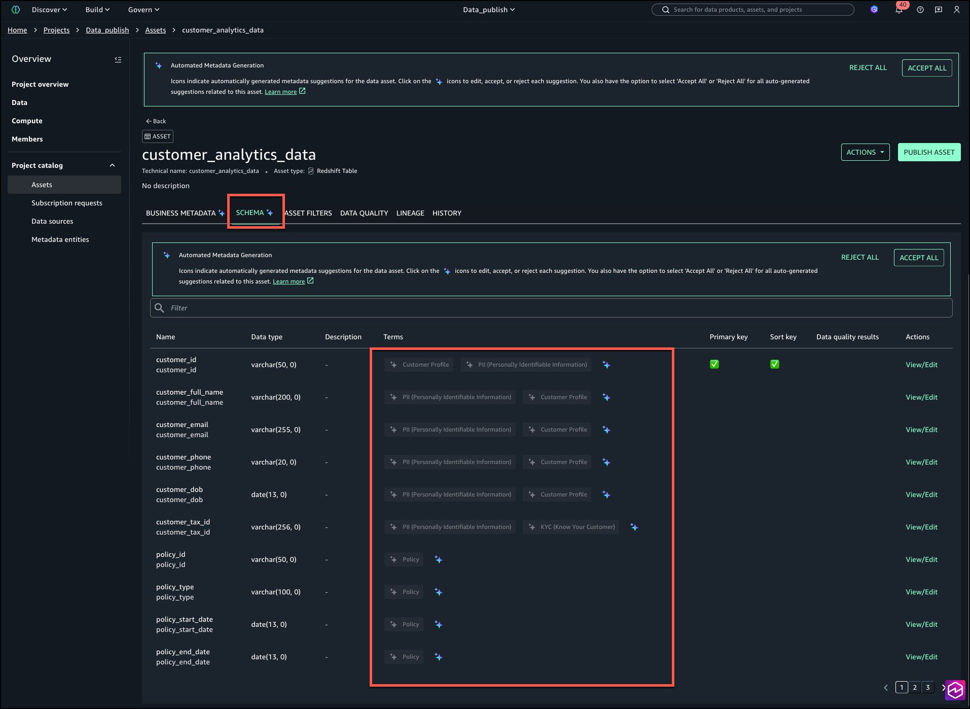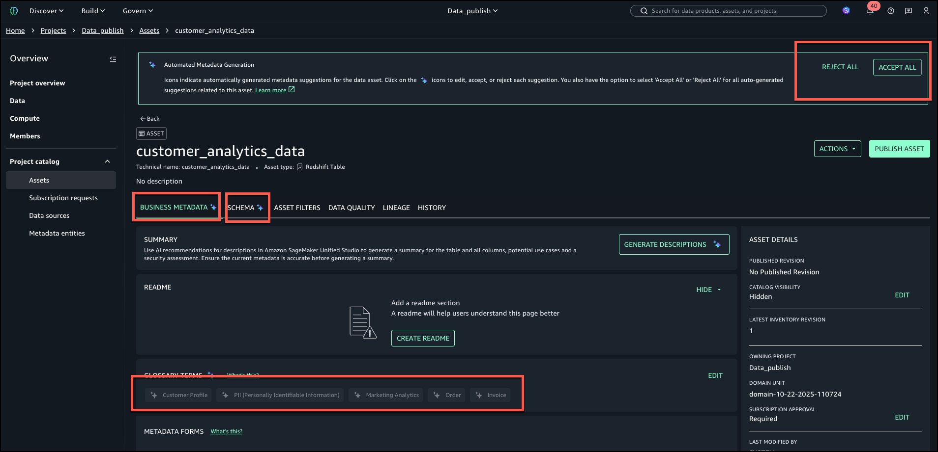 Amazon SageMaker Catalog supplies automated knowledge classification that means enterprise glossary phrases throughout knowledge publishing. This helps to cut back the guide tagging effort and enhance metadata consistency throughout organizations. This functionality analyzes desk metadata and schema info utilizing Amazon Bedrock language fashions to advocate related phrases from organizational enterprise glossaries. Knowledge producers obtain AI-generated strategies for enterprise phrases outlined inside their glossaries. These strategies embrace each purposeful phrases and delicate knowledge classifications reminiscent of PII and PHI, making it simple to tag their datasets with standardized vocabulary. Producers can settle for or modify these strategies earlier than publishing, facilitating constant terminology throughout knowledge belongings and enhancing knowledge discoverability for enterprise customers.