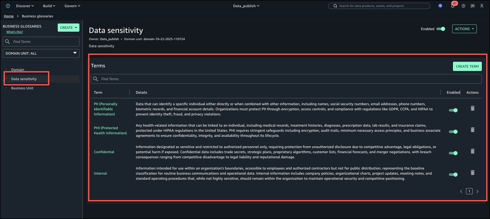 - Producers obtain a set of strategies from the outlined enterprise glossary phrases for classification that may embrace each purposeful and sensitive-data glossary phrases.