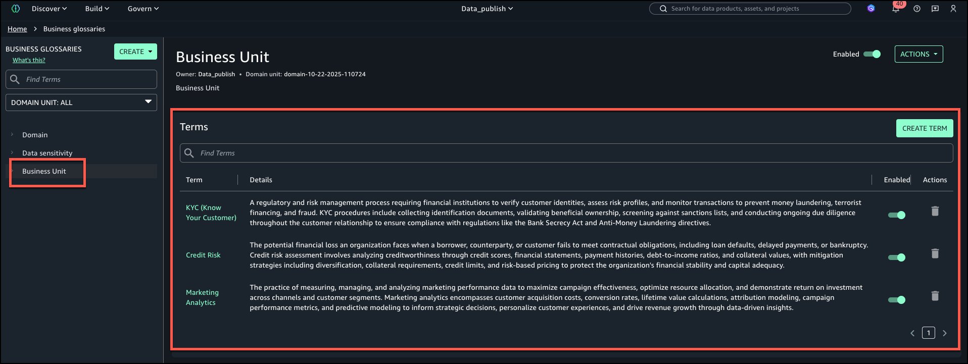 The next is the view of ‘Enterprise Unit’ enterprise glossary with all phrases added.