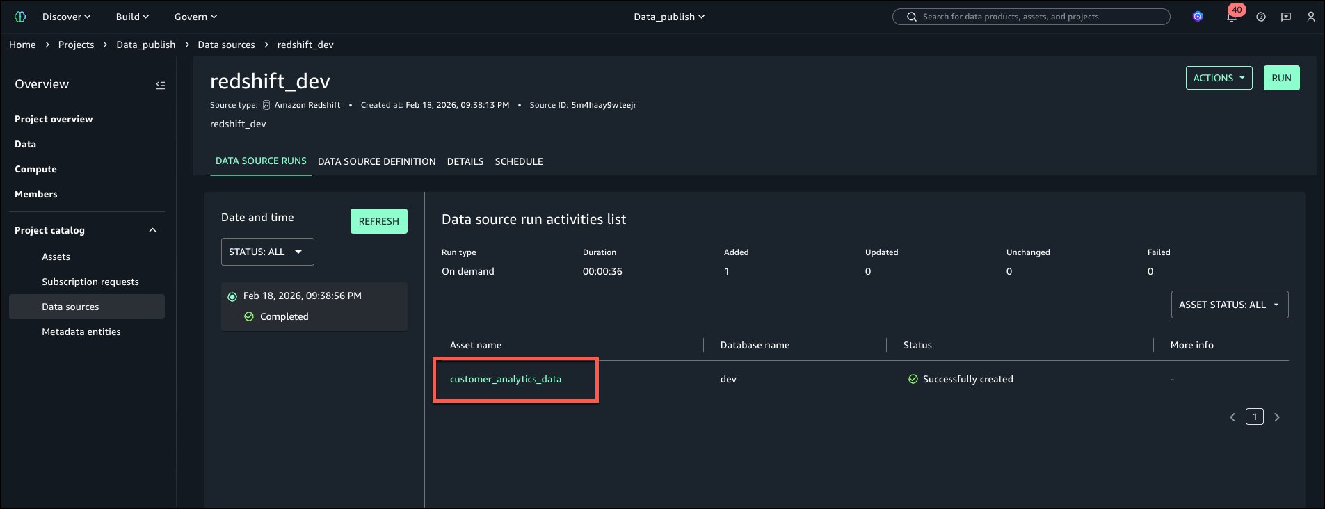 As soon as the Redshift is onboarded with above steps, navigate to Challenge catalog from left navigation menu and select Knowledge sources. Run the Knowledge Supply so as to add the desk to Challenge stock belongings.