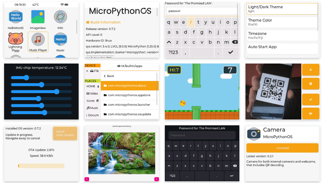 MicroPythonOS is constructed completely in MicroPython, which is maybe essentially the most shocking facet of this challenge. Somewhat than counting on a conventional compiled kernel, the system consists of a skinny working system layer accountable for {hardware} initialization, multitasking, and consumer interface administration. Every thing else — together with Wi-Fi configuration, firmware updates, and system settings — is carried out as an app. This app-centric design intently mirrors the structure of contemporary cell working techniques and makes the platform each versatile and approachable.