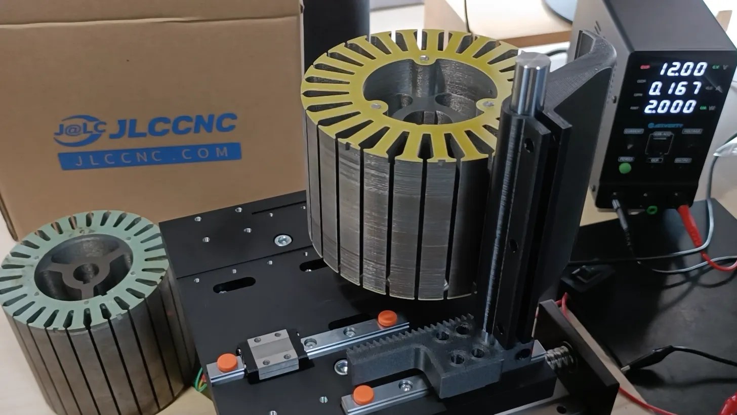 Managing that mass was the main focus of this new motor winding machine design. The primary stator axis was scaled as much as 25mm and the unique lead screw was upgraded to a ball screw. Beefier mechanical elements had been CNC-milled by JLCCNC.